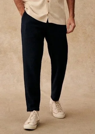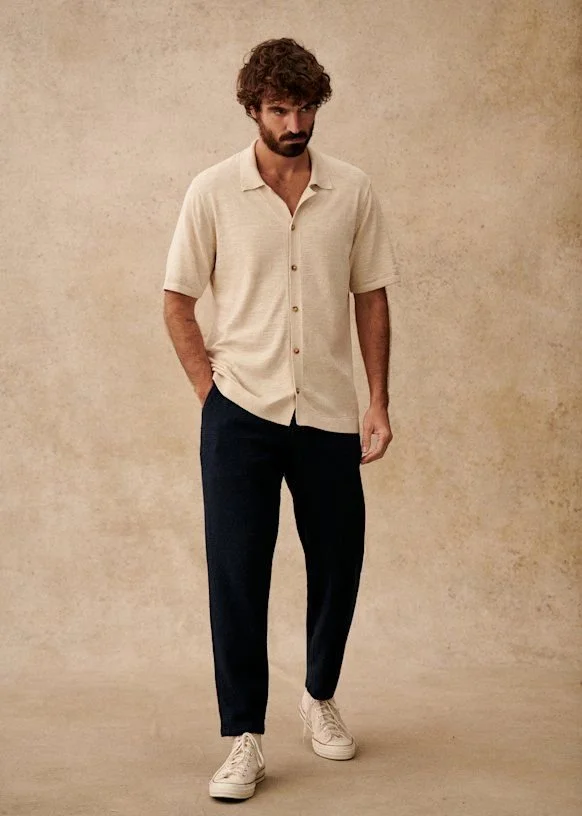 Cream knit shirt with navy trousers and white sneakers from Octobre Editions. A clean summer staple.